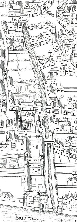 Image courtesy of Wikipedia. Detail from the “Copperplate” map of London, surveyed 1553-9, showing the southern course of the River Fleet from Holborn Bridge to the Thames.
