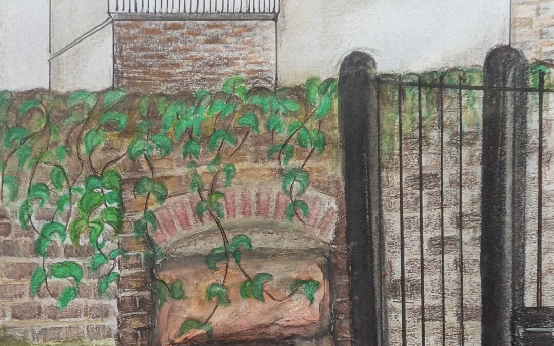 After the war, it was decided not to rebuild the houses but incredibly, set in the back of a garden wall, an original fireplace from one of the destroyed homes is still visible.